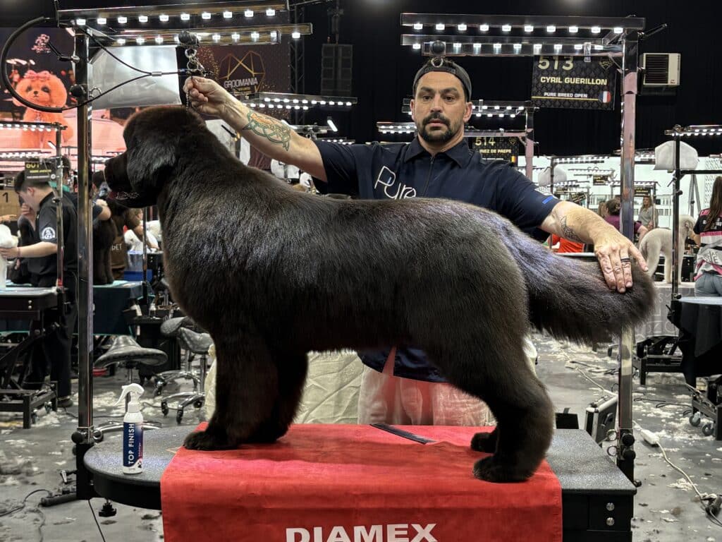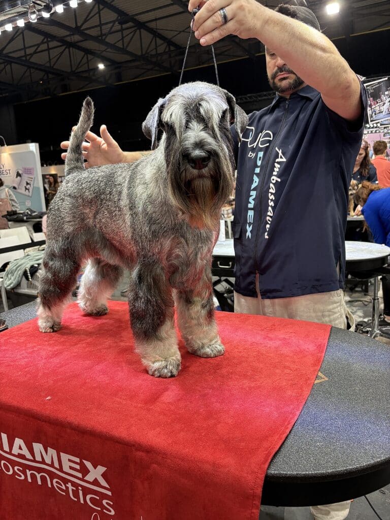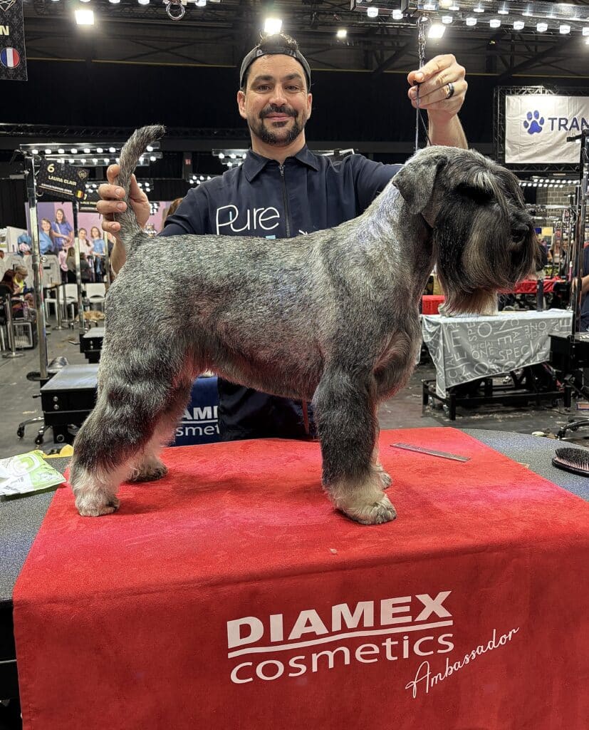 Cette année je suis revenu mieux préparé, fort de beaucoup d’entrainement et de stage de perfectionnement. J’ai concouru dans 2 catégories : épilation avec ma jolie Schnauzer moyen, et coupe ciseaux avec mon fidèle Toto le Terre-Neuve. Et ce travail a payé, je rentre avec une magnifique 3ème dans la catégorie épilation, contre 19 concurrents.